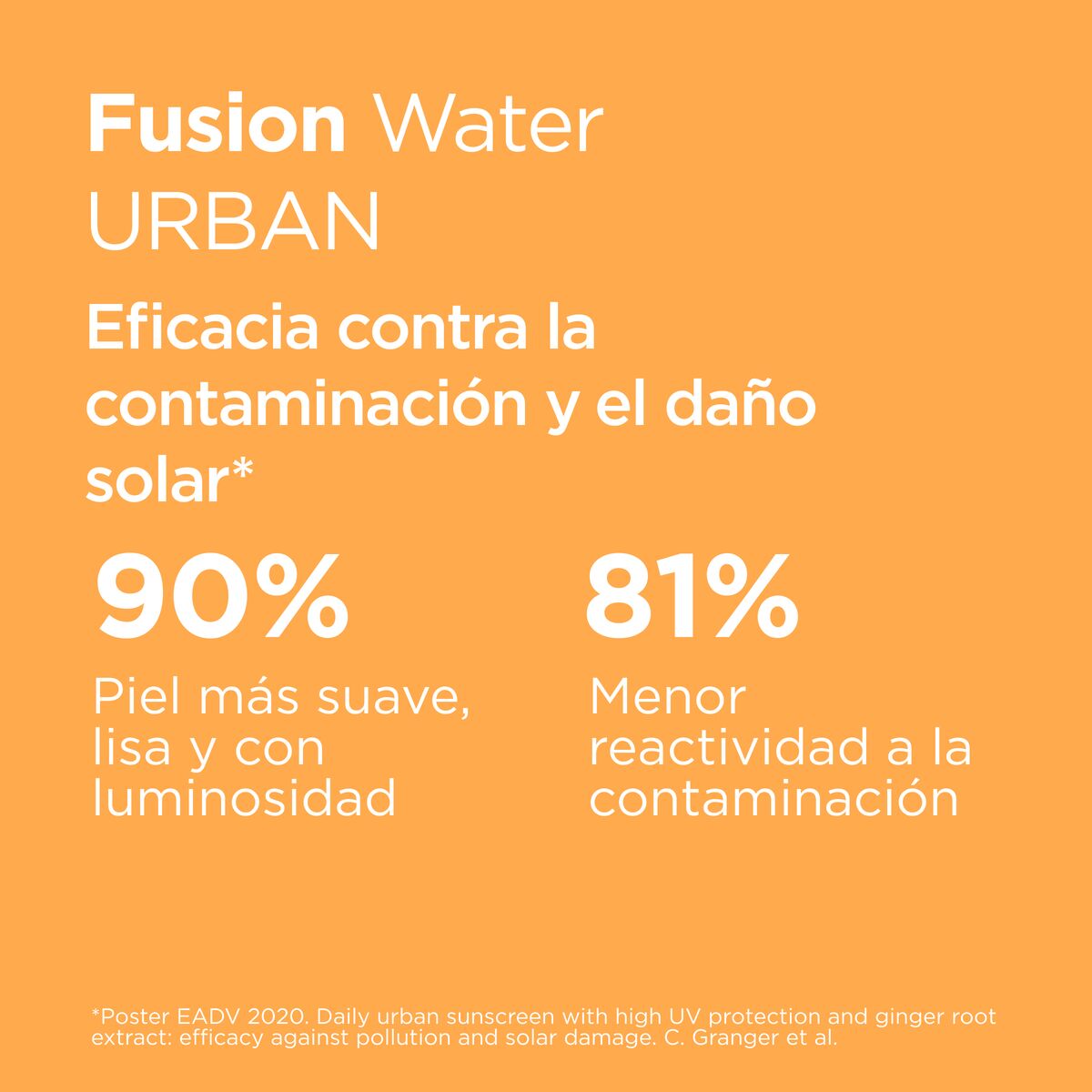 Fusion Water URBAN protege la piel frente a la radiación solar con un SPF 30 y protección UVA, así como acción antioxidante frente al estrés oxidativo inducido por la Luz Azul solar y la Polución Urbana. No comedogénico. Oil-free. Hipoalergénico.