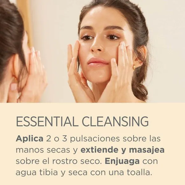 Essential Cleansing es un aceite limpiador facial suave y ligero de textura oil-to-milk que utiliza el poder del aceite para limpiar en profundidad la piel. En contacto con el agua se transforma en una agradable emulsión que deja la piel suave e hidratada.