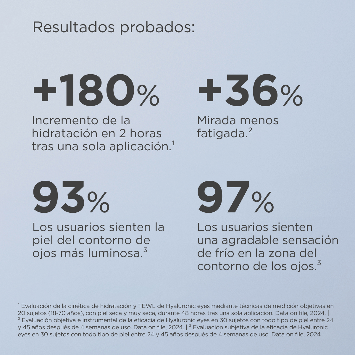 Dale un boost de energía a tu mirada con Hyaluronic Eyes, el contorno de ojos con ácido hialurónico que incrementa la hidratación en un +180% en 2 horas¹. Refresca y descongestiona la zona, ayuda a combatir las líneas de expresión asociadas a la deshidratación, y promueve una piel más luminosa.